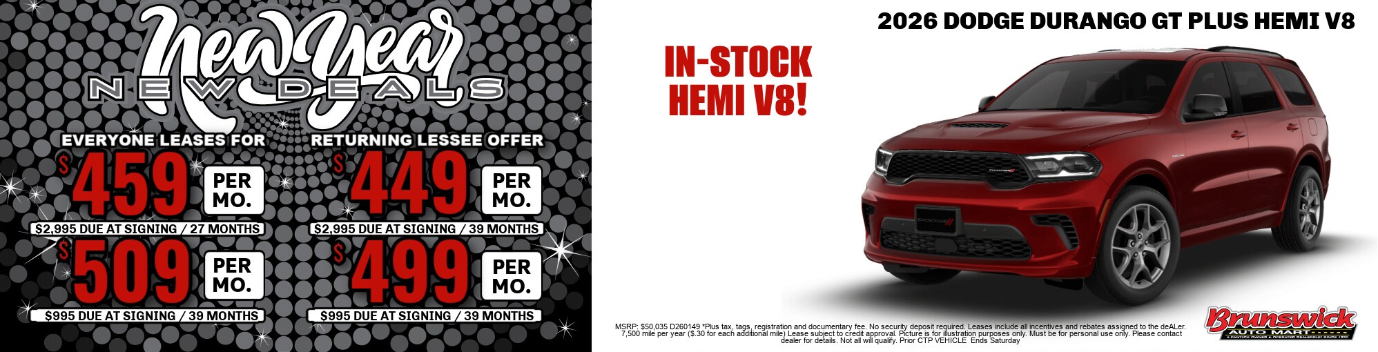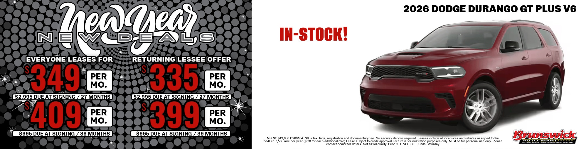 Lease a New Dodge Durango with our special offer here at Brunswick Auto Mart! If you want to take advantage of this great new Dodge offer, contact our Brunswick Dodge dealer today! * The advertised price does not include sales tax, vehicle registration fees, other fees required by law, finance charges and any documentation charges. A negotiable administration fee, up to $115, may be added to the price of the vehicle.